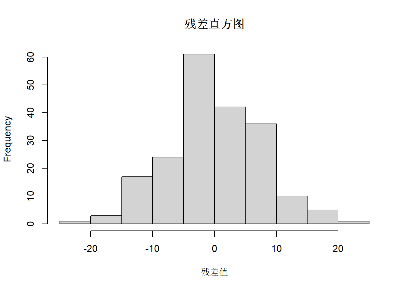 hist(resid, main = "残差直方图", xlab = "残差值")