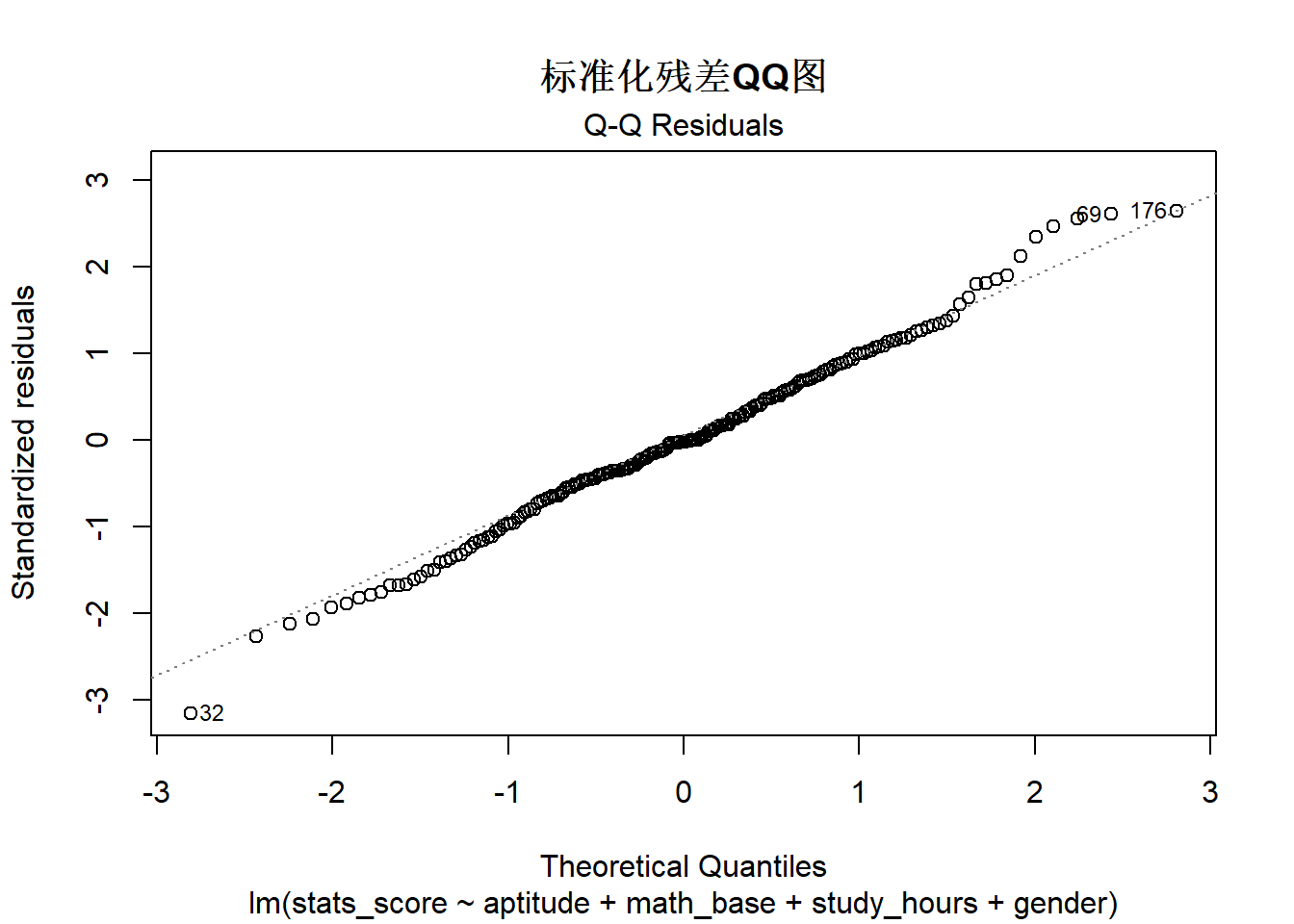 # 标准化残差QQ图(代码:plot(fit, which = 2))