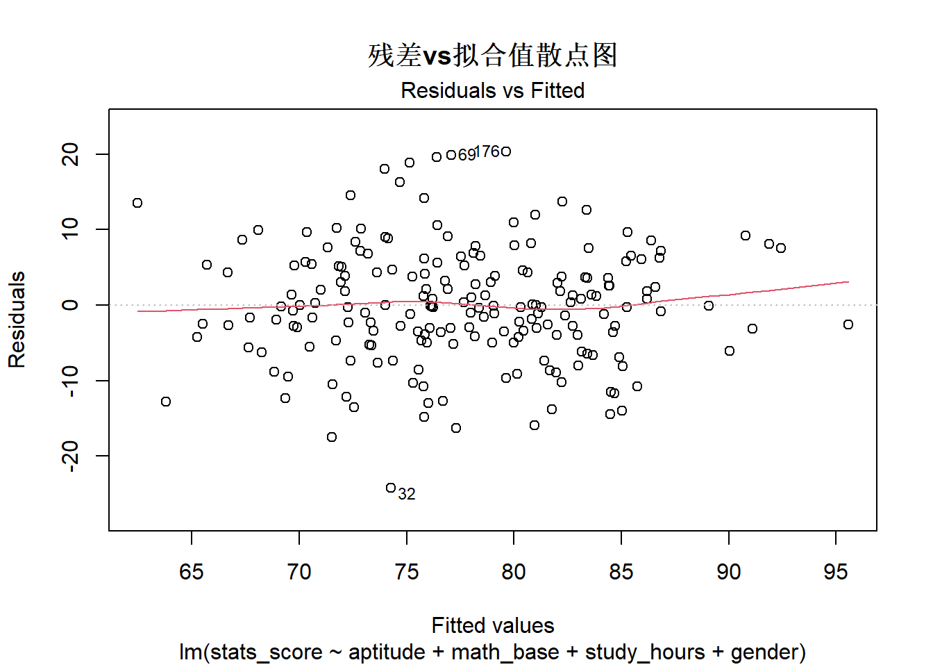 # 残差vs拟合值散点图(代码:plot(fit, which = 1))